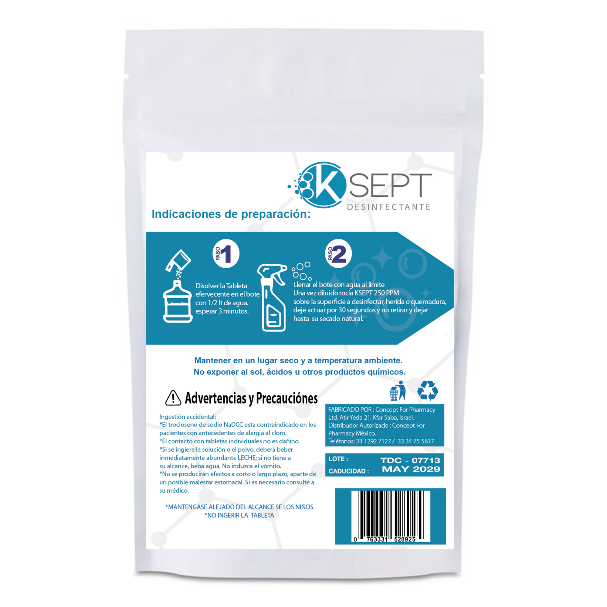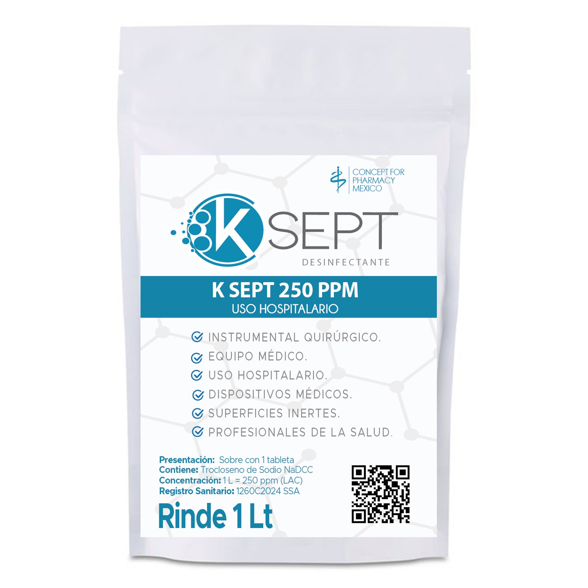 - K SEPT 250 ppm: tableta efervescente de 250 mg (c/o), para preparar 1 L = 250 ppm LAC.