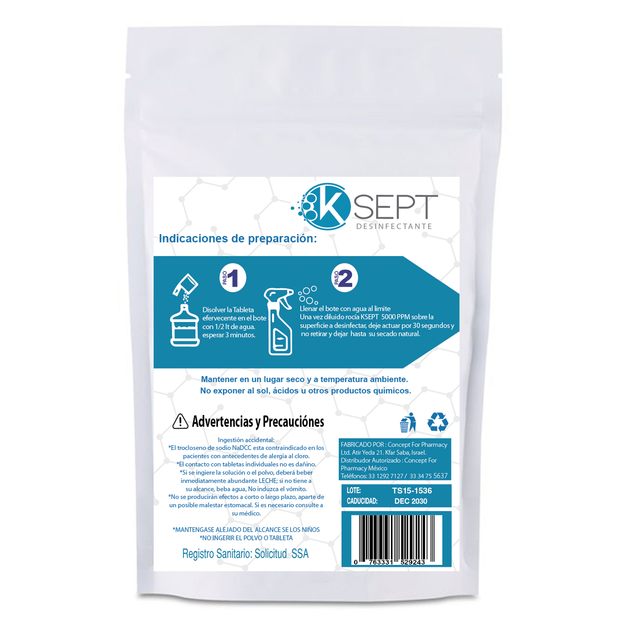 K SEPT 5000 ppm es una tableta efervescente a base de Trocloseno de sodio (NaDCC) que, al disolverse en agua, genera una solución con 5000 ppm de cloro latente activo (LAC) con efecto desinfectante.