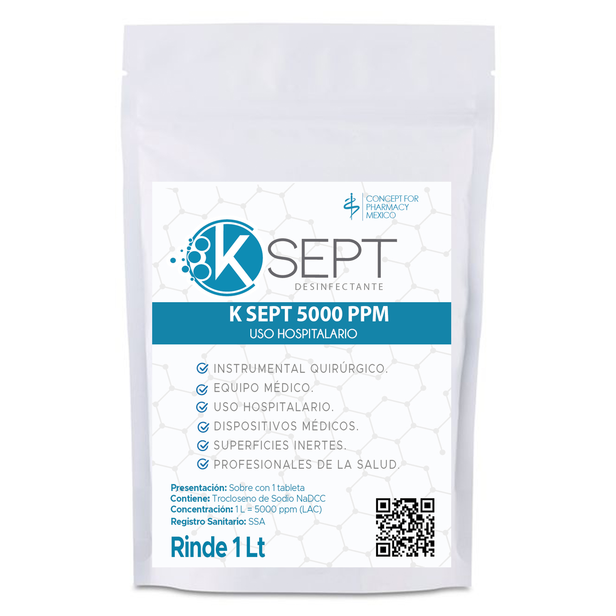- K SEPT 5000 ppm: tableta efervescente de 5000 mg (c/o), para preparar 1 L = 5000 ppm LAC.