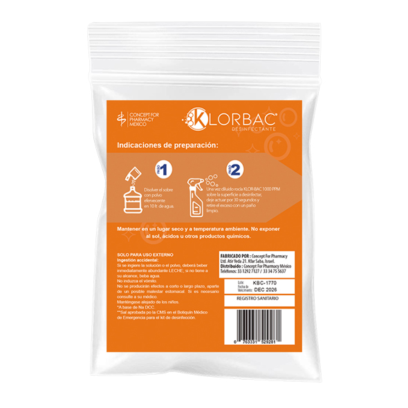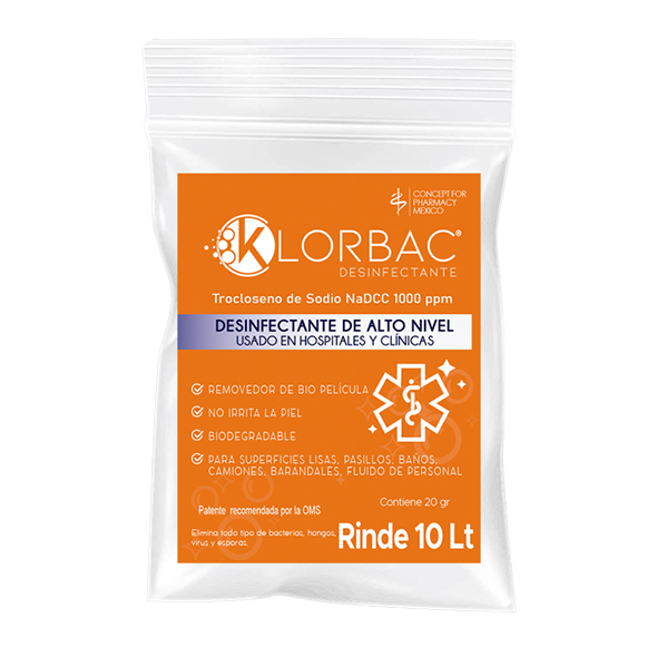 KLOR BAC ppm (granulado) es un desinfectante de alto nivel y amplio espectro a base de Trocloseno de sodio (NaDCC), formulado con tensoactivo-detergente, con olor ligero a cloro (LAC).