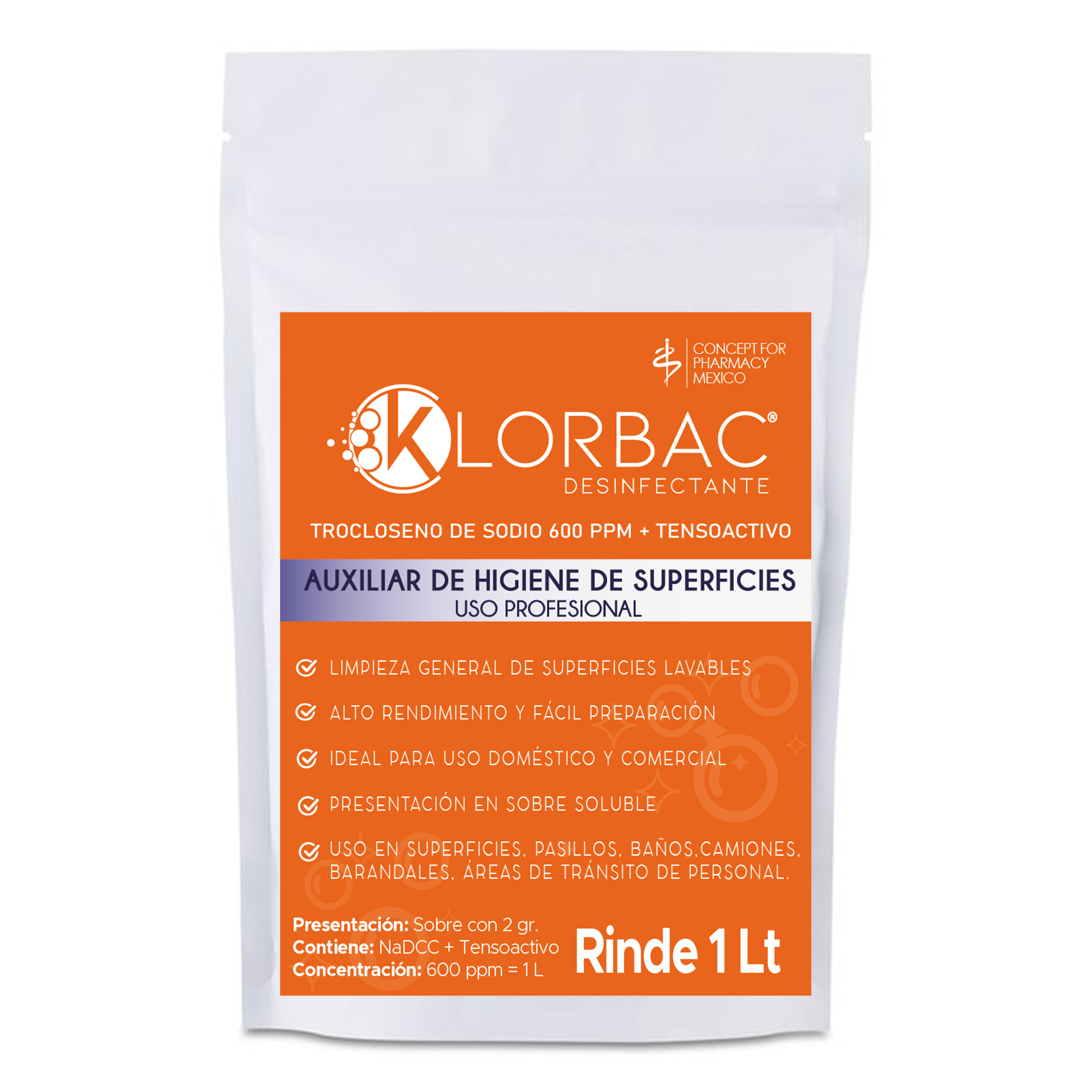 KLOR BAC ppm (granulado) es un desinfectante de amplio espectro a base de Trocloseno de sodio (NaDCC), formulado con tensoactivo-detergente, con olor ligero a cloro (LAC).