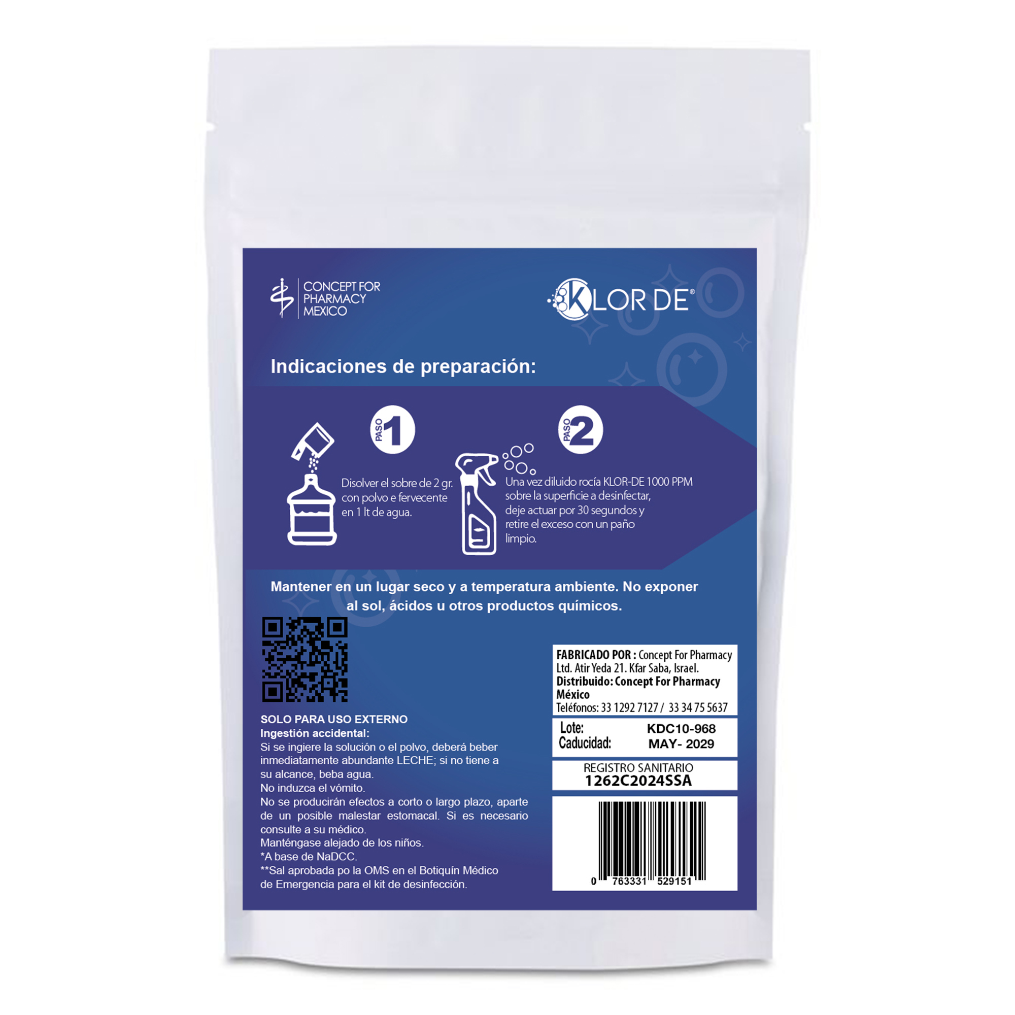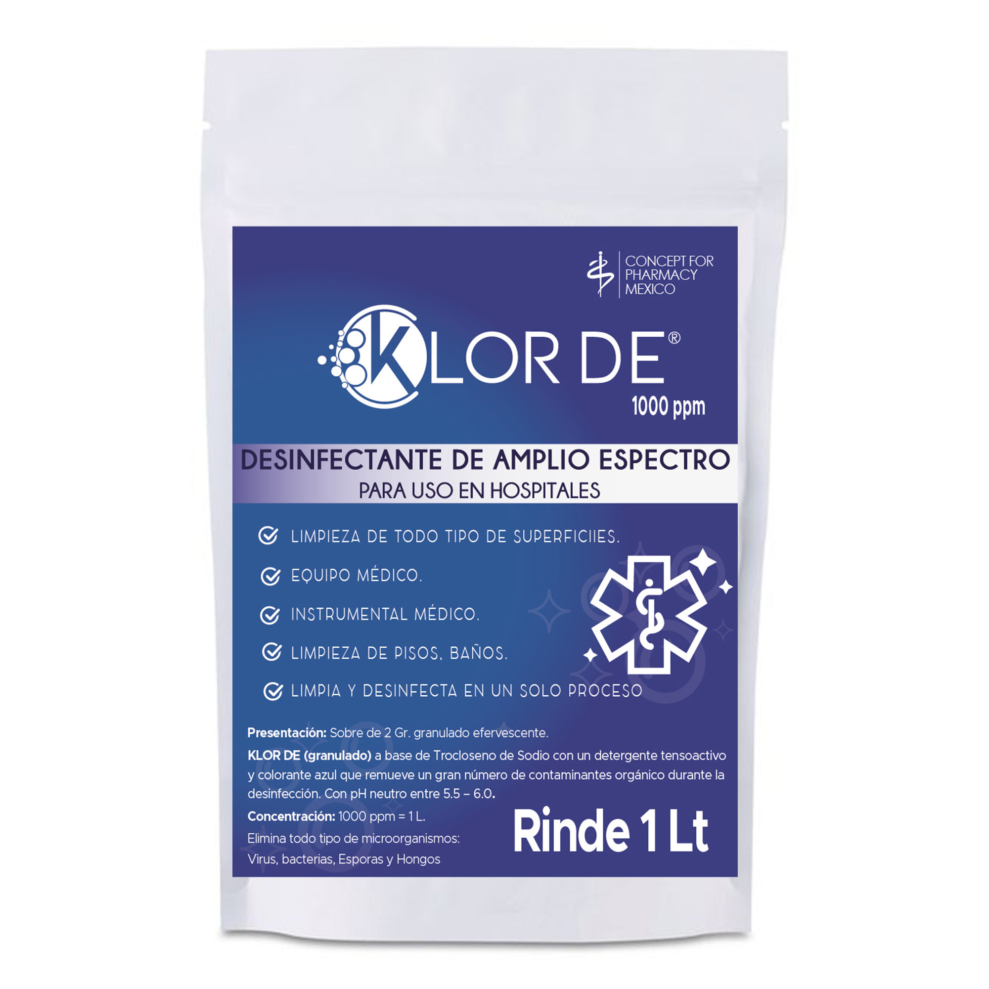 KLOR DE 1000 ppm (granulado) es un desinfectante de amplio espectro a base de Trocloseno de sodio (NaDCC), formulado con tensoactivo-detergente y colorante azul. Se presenta como granulado azul, con olor ligero a cloro (LAC).