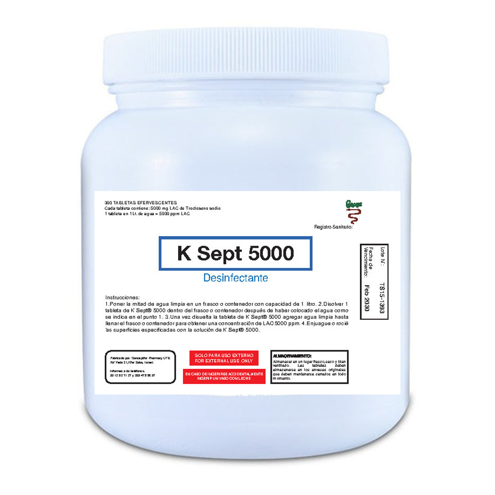 - K SEPT 5000 ppm: tableta efervescente de 5000 mg (c/o), para preparar 1 L = 5000 ppm LAC.