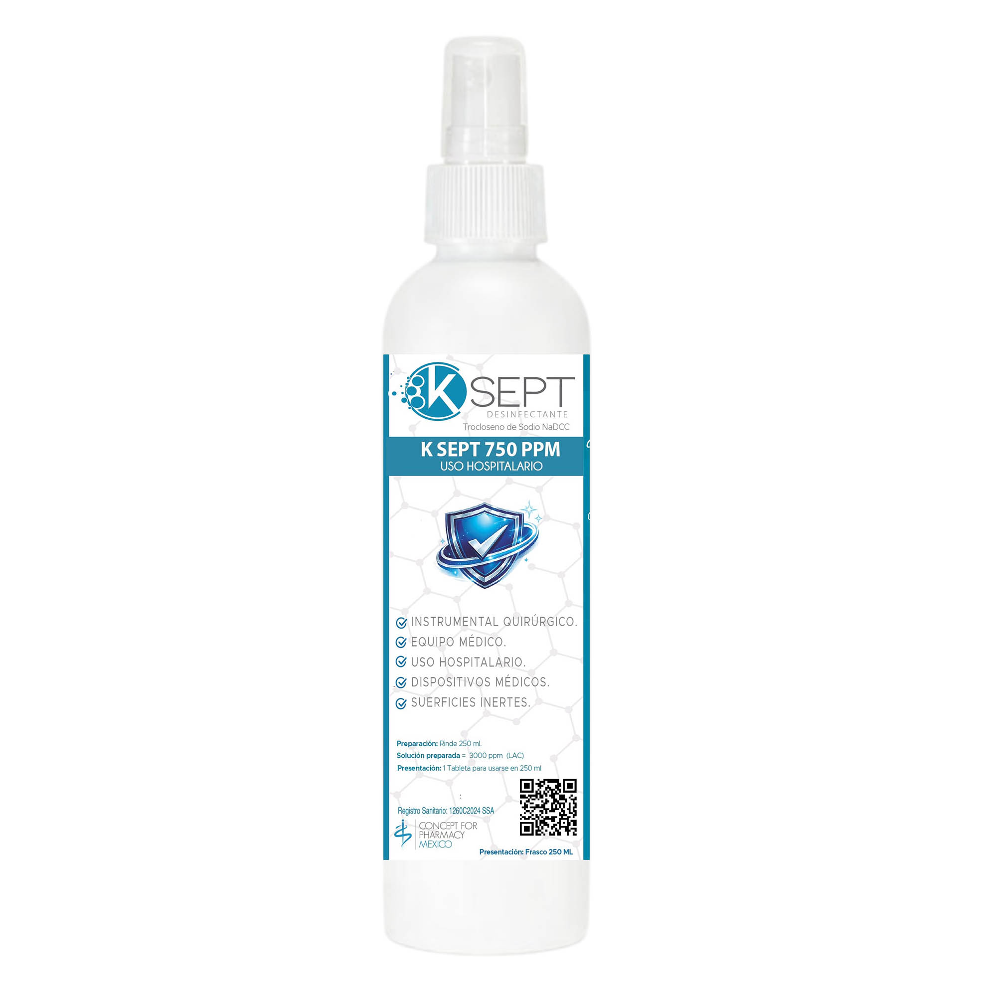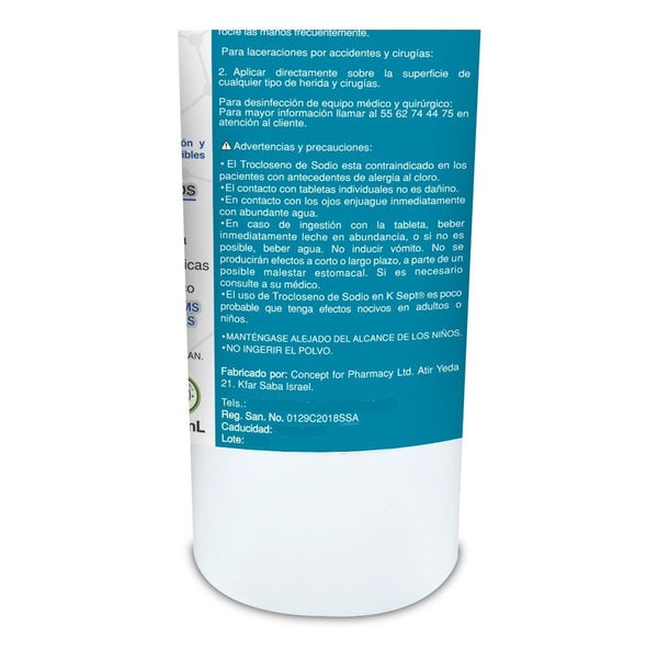 | K SEPT 750 ppm | Tableta efervescente | 750 mg (c/o) | 1 tableta en 1 L = 750 ppm (LAC) |