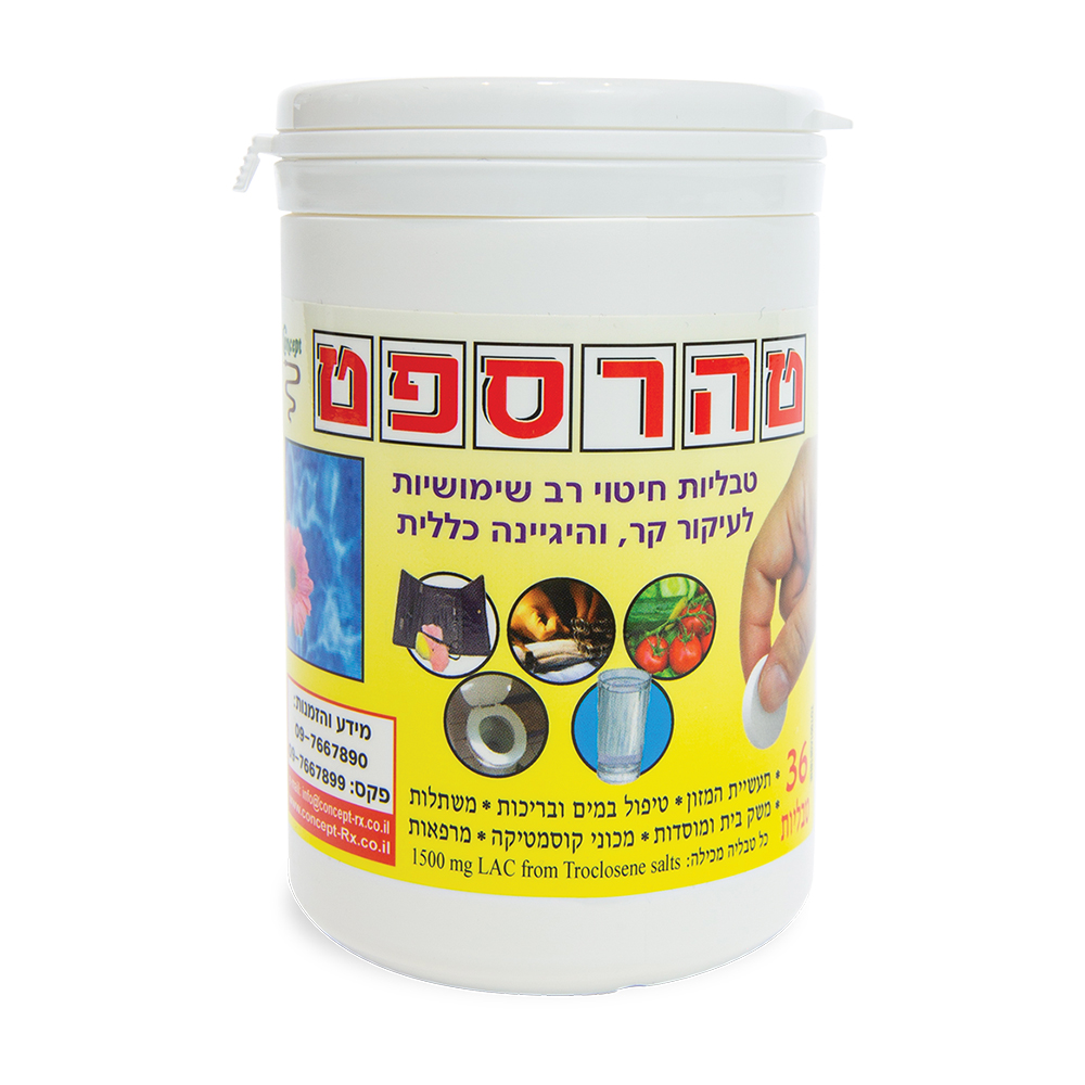 Una forma estable de dosis sólida para la desinfección del agua para uso humano. Taharmayim está aprobado para su uso a nivel mundial en la purificación de agua potable (Sistema de Codificación Común de las Naciones Unidas, UNCCS n.° 856461) y se ha utilizado durante muchos años en ejércitos occidentales [Reino Unido, Irlanda, Alemania, Francia, Australia, Canadá, Fuerzas de Defensa de Israel (FDI), etc.] y organizaciones de ayuda humanitaria como la Cruz Roja, UNICEF y OXFAM.